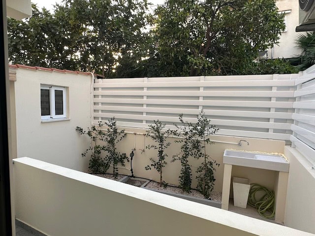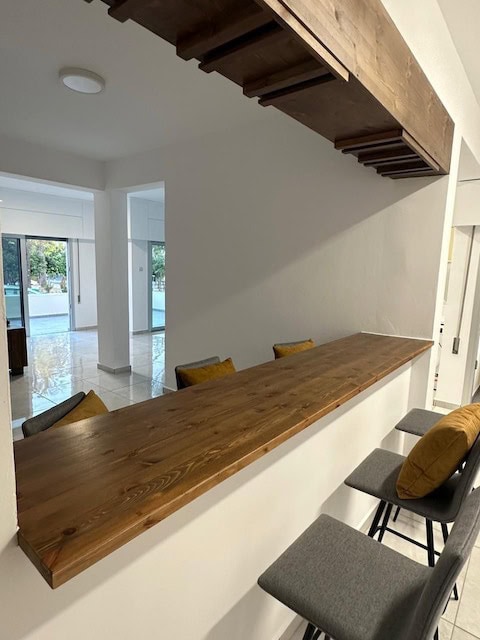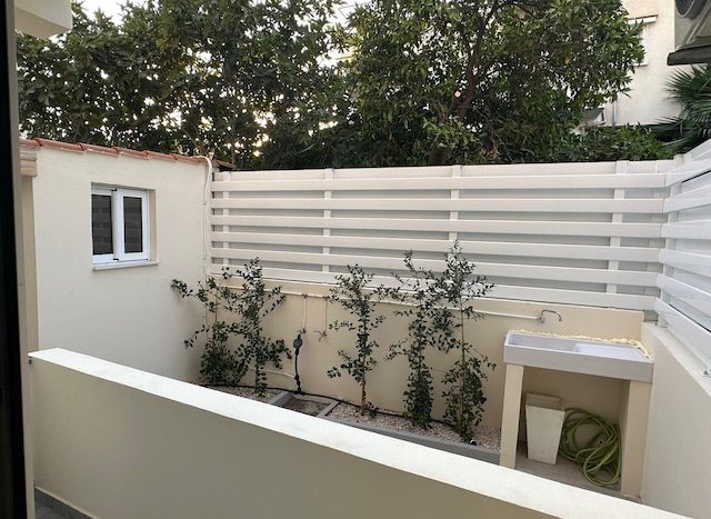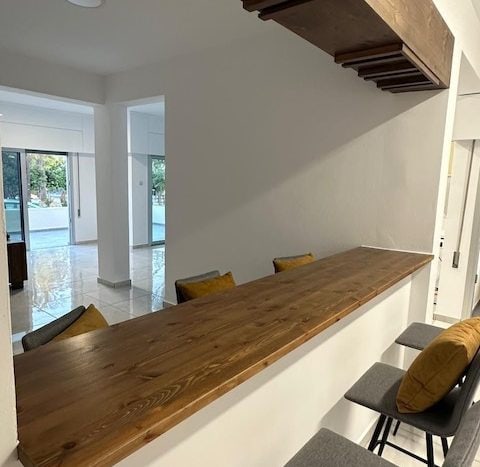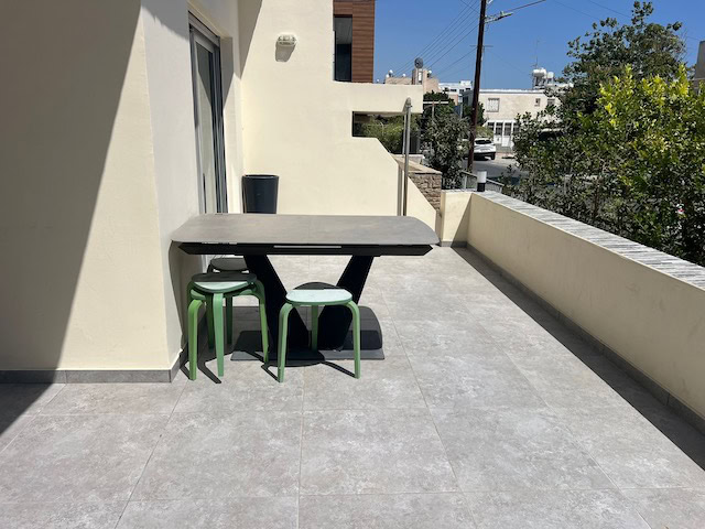 With a total internal area of 120sqm, and 20sqm covered veranda, the flat consists of a fully equipped kitchen, an island bar, spacious living/dining area, 2 bedrooms and 1 bathroom. The apartment was fully renovated. It comes partly furnished and equipped with everything you need. Also, there is a small studio behind the house. It is also equipped with CCTV cameras.