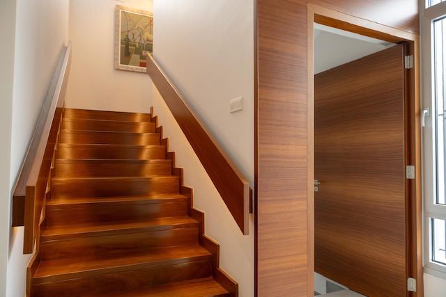 Solid Iroko wood used for kitchen, doors, staircase, and wardrobes