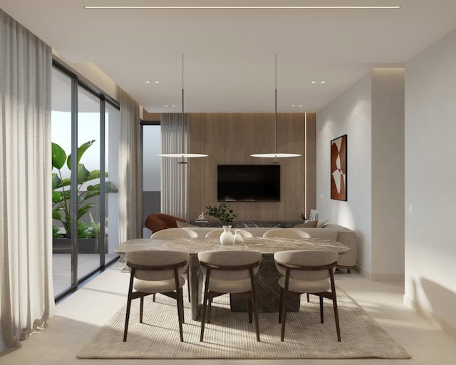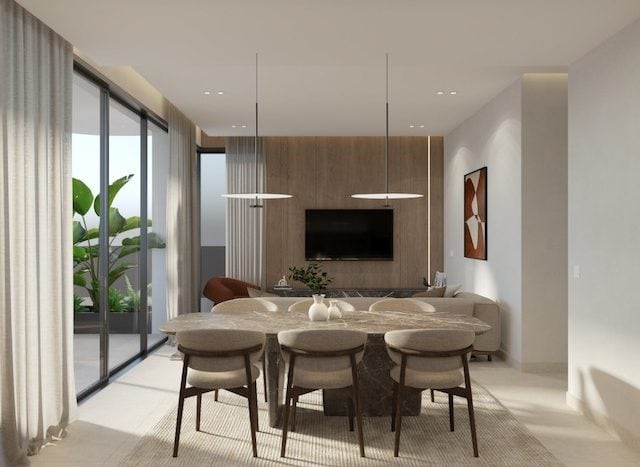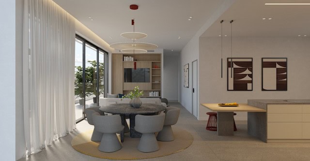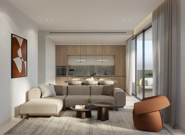 • Open-plan living, dining, and kitchen area