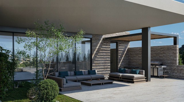 Outdoor BBQ and entertainment areas