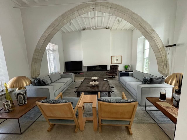 Spacious living area with wood-burning fireplace