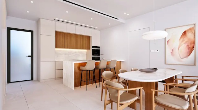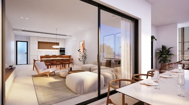 Open-plan living, dining, and kitchen area