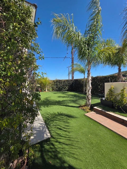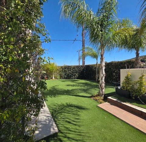 - Large landscaped garden with artificial grass