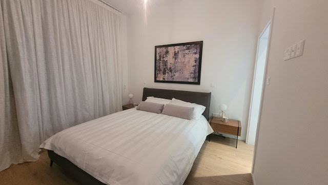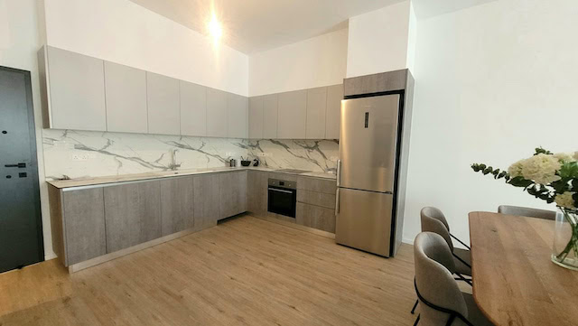 The apartment is situated on the 3rd floor of the new contemporary building, and consists of an open plan kitchen, living/dining area opening to a spacious covered veranda, 2 bright bedrooms and 1 bathroom.